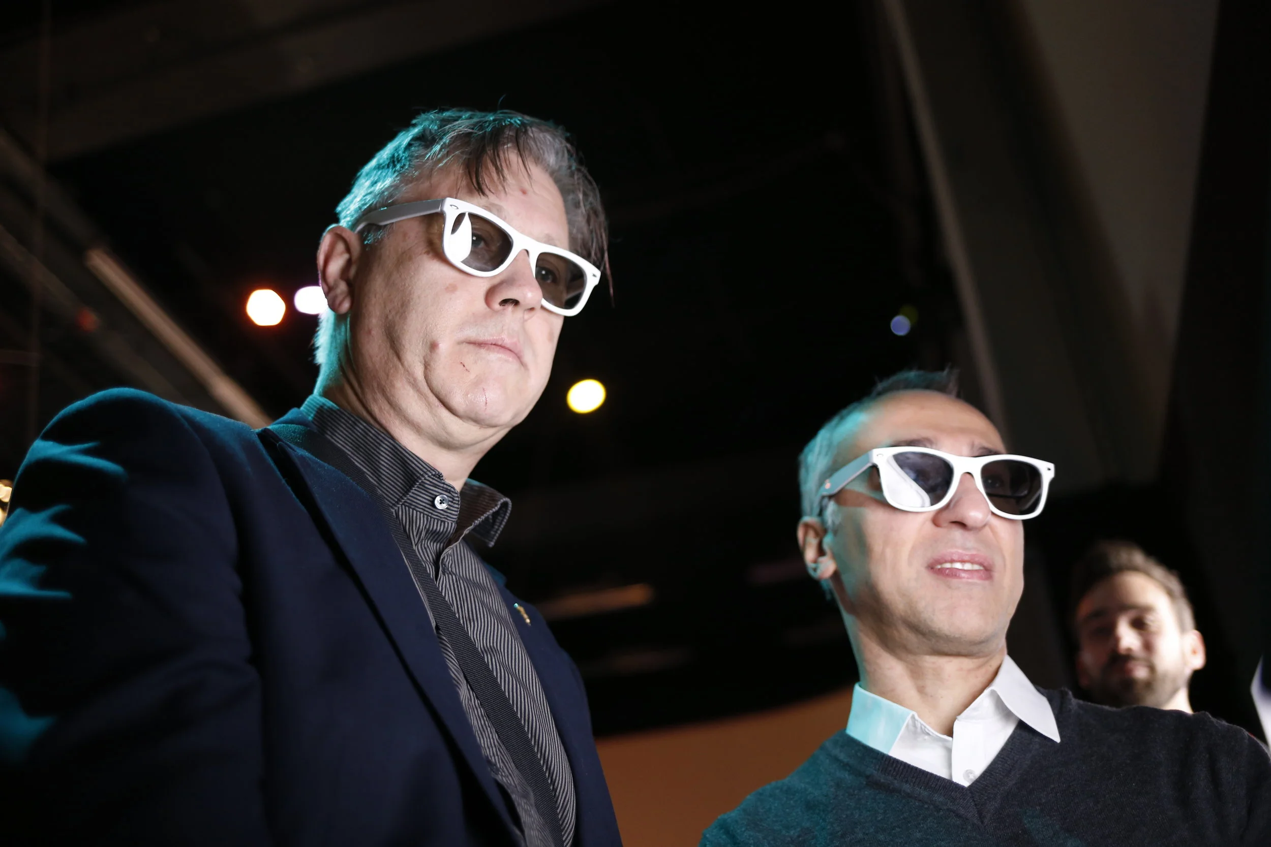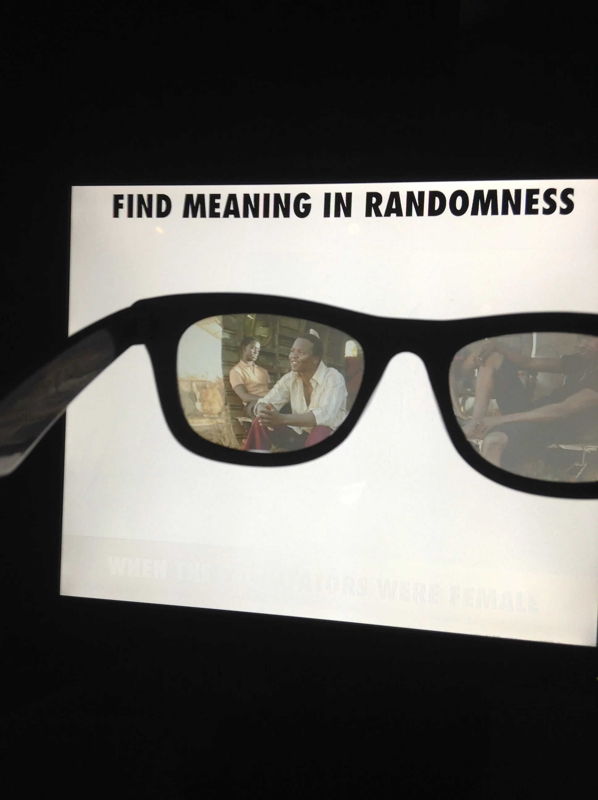 Not Here, Not Know forces the participant to find meaning in arbitrary associations, by asking two participants to agree on a meaning between a random image and text pair, which is then shared with the world. Two participants are placed in front of a screen which generates these sentences with a random sentence generator program, and images were curated by the artist. No one but the two participants can see the image: they are on a monitor which requires special polarized glasses to view what is on it. The participants then must hit a button as to whether the sentences make sense with the image in some way, whether it be informative, irony, humor, sadness—any way which speaks to the participant as an individual. When they both agree, the image-text combination is displayed in a group slideshow for any viewer to see.